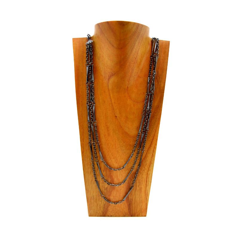 Turned bar and chain necklace. 3 draping strands of metal chain and bars. Solid color.