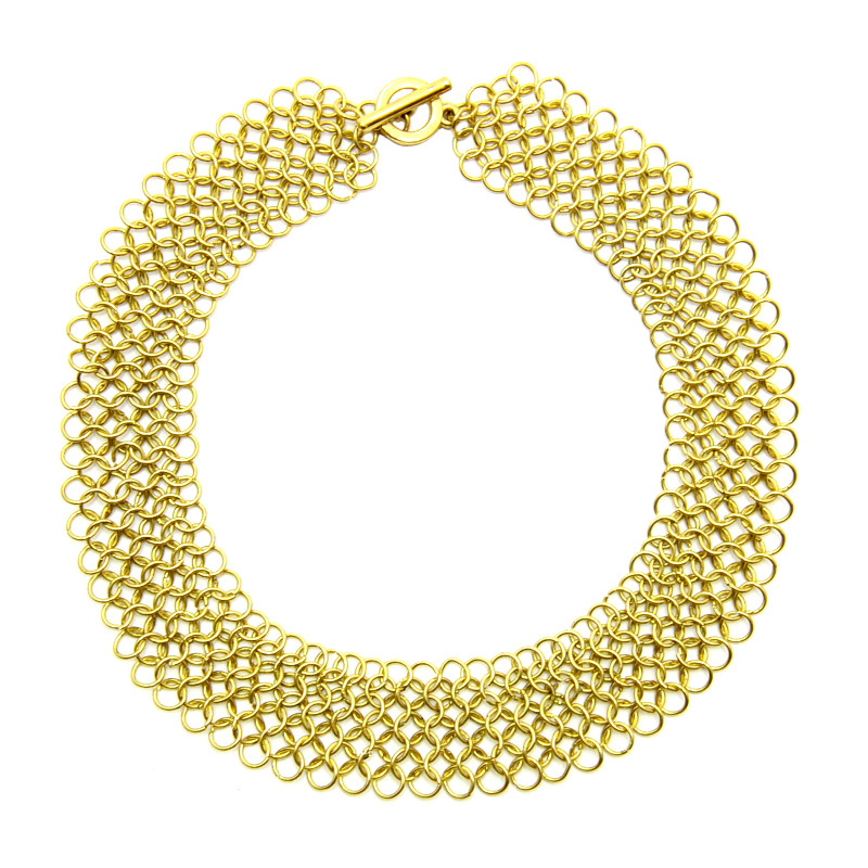 Metal chain mesh collar necklace. Each ring hand linked to the next.