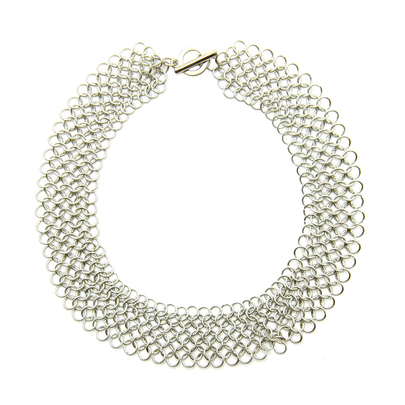 Metal chain mesh collar necklace. Each ring hand linked to the next.