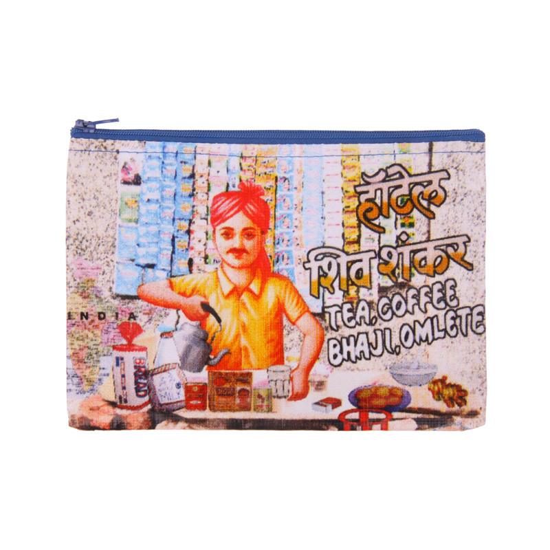 "Chai Time" small flat pouch. Zippered opening.